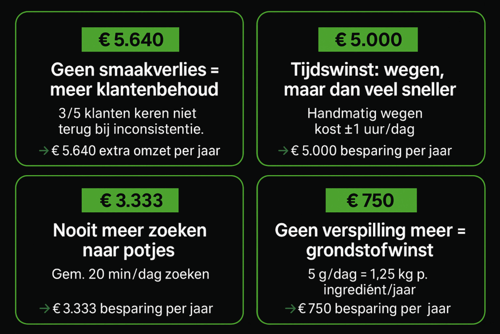 Met Autogram verdwijnt het zoeken naar potjes, worden fouten voorkomen en blijft de smaak altijd gelijk. Dat geeft structuur in de keuken én levert meer dan €10.000 per jaar aan besparingen en extra omzet op.